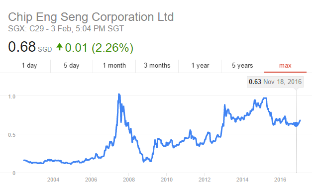 Since debt is at such a high level, could the company procure more loans to fund a comparable revenue in 2017, 2018 and 2019 as compared to 2016? Remember, we are not even talking about growth here. And of course, without a doubt, its growth has been funded by debt in recent years. In cyclical companies such as Chip Eng Seng whose main businesses are that of construction, property development and property investments, wouldn’t a fall in revenues affect it as its debt levels are very high?