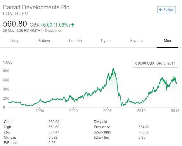 Today, in mid 2018 as I write this, Barratt’s market capitalization is 5.68 billion. Back in 2008, the market capitalization of Barratt Developments was only 240 million, a far cry of today’s market capitalization. The company’s price appreciation is shown below.