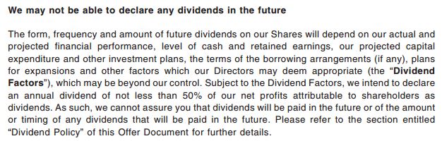 The prospectus also seems attractive. The listing is positioned as a defensive business, highly cash generative with the intention to pay out 50% as dividends. Now, note that it is just an intention to pay out  50% of net profits which any any company management can claim. Please take that with a pinch of salt. While the argument can be made that the company is a defensive one, how does one justify paying $0.25 for a net asset value per share of $0.0456? That seems to be a price that is too high for one’s good. The risk to reward ratio is not good in my opinion. There may be some slight upside but on valuation concerns, the downside is greater than the upside.