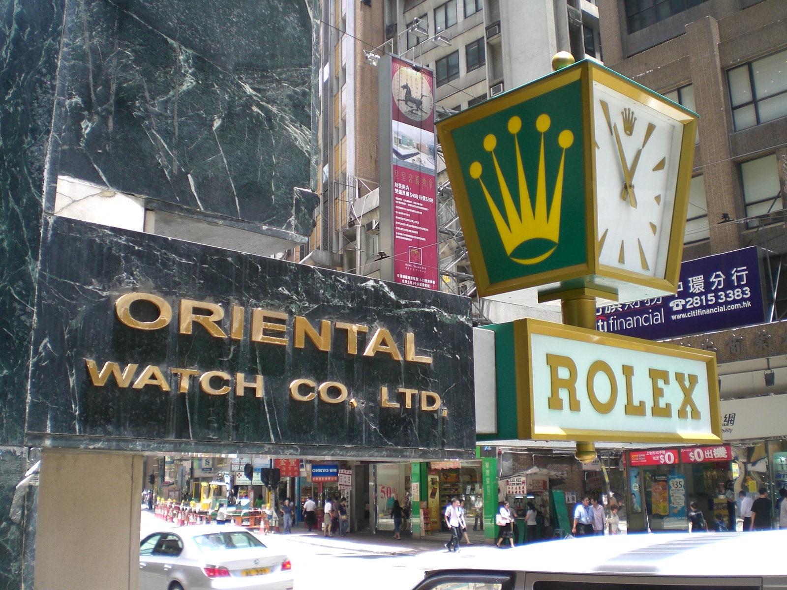 Emperor Watch & Jewellery stores line the streets of Hong Kong where tourists and locals abound.[/caption]